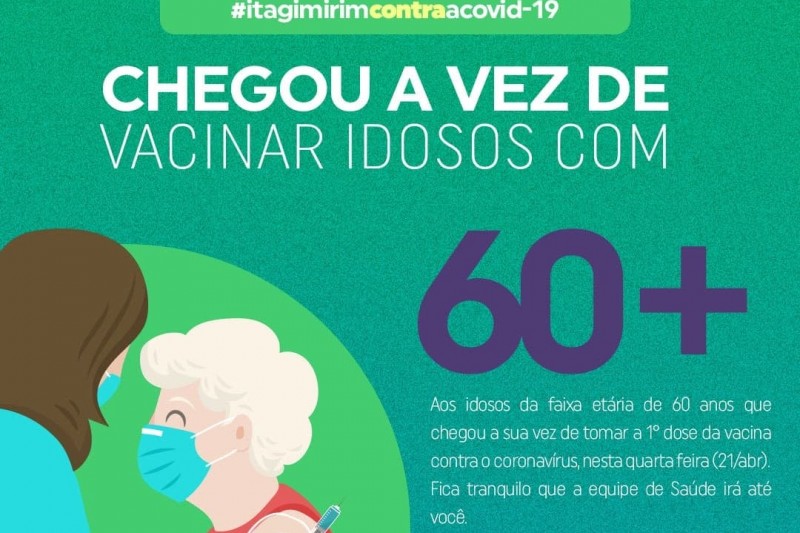 O Governo Municipal de Itagimirim informa aos idosos da faixa etária de 60 anos, que chegou a sua vez de tomar a 1° dose da vacina contra o coronavírus, nesta quarta feira (21/abr).
