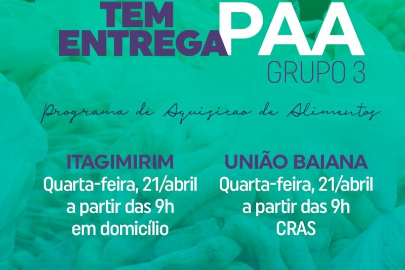 Nesta quarta-feira (21/abr), tem entrega dos kits do Programa de Aquisição de Alimentos para os moradores de Itagimirim e União Baiana inscritos no Grupo 3.